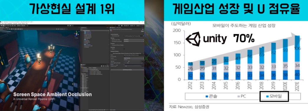 유니티는 게임 및 3D 작업을 할 수있는 개발 소프트웨어 입니다. 유니티의 점유율을 보면 시장에서 약 70%를 차지하고 있는 것을 볼 수 있는데요. 컴퓨터 뿐만이 아니라 모바일분야에서도 점유율이 점차 높아지는 것을 볼 수 있습니다. 메타버스에서 3D 기술은 필수이기 때문에 유니티도 메타버스와 같이 높게 성장할 것을 기대해 볼 수 있습니다.