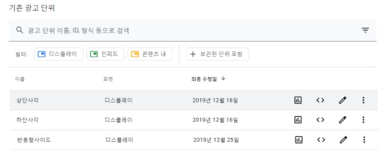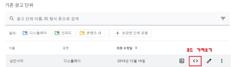 그러면 위 사진과 같이 광고 단위가 만들어진 것을 볼 수 있습니다. 코드 가져오기 버튼 <>을 클릭해 줍니다.