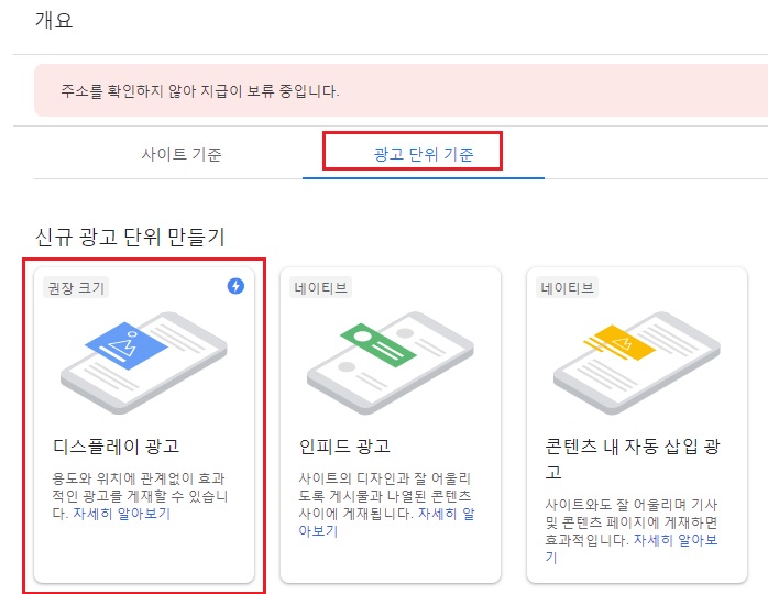 다시 구글 애드센스 화면으로 돌아와 애드센스 광고 단위를 만들어 줍니다. 광고 단위에는 여러 가지가 있지만 가장 편하고 효과가 좋은 디스플레이 광고를 클릭합니다.