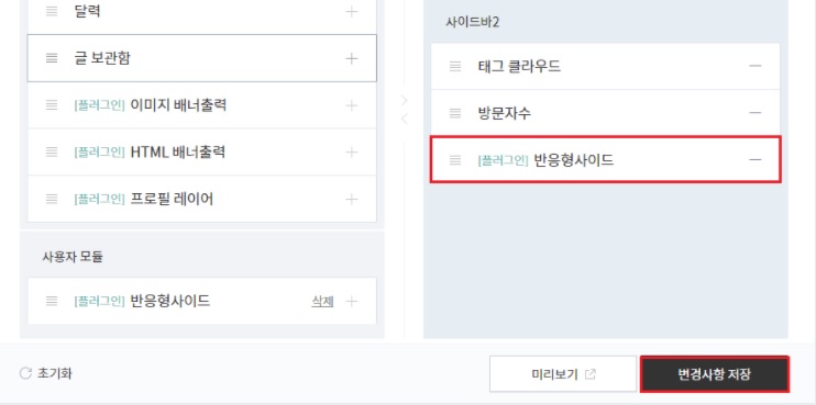 반응형 사이드 광고를 상단 사각, 하단 사각과 동일한 방법으로 구글 애드센스에서 만들어 줍니다. 그리고 이후 사이드 광고의 코드를 복사한 후 블로그 관리자 모드로 들어옵니다. 관리자 설정에서 사이드바를 클릭하여, [플러그인] HTML 배너 출력을 추가한 후 편집을 클릭합니다.